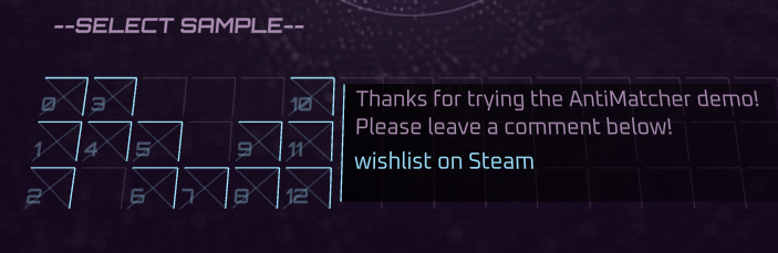 This is a demo version of our upcoming game, AntiMatcher. We've made the demo playable in browser to make it super easy to try! The download size is about 35 MB.
